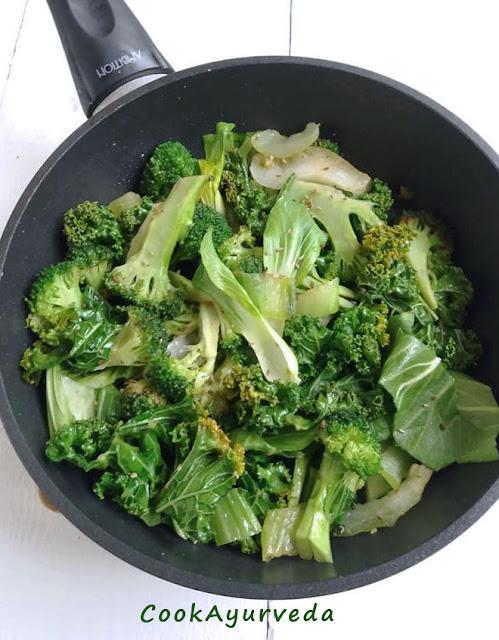 Do przygotowania dania użyłam jarmużu, brokuła i kapusty pak choi. Zgodnie ze wskazaniami Ajurwedy użyłam przypraw, które sprawiają, że warzywa są łatwiej strawne.